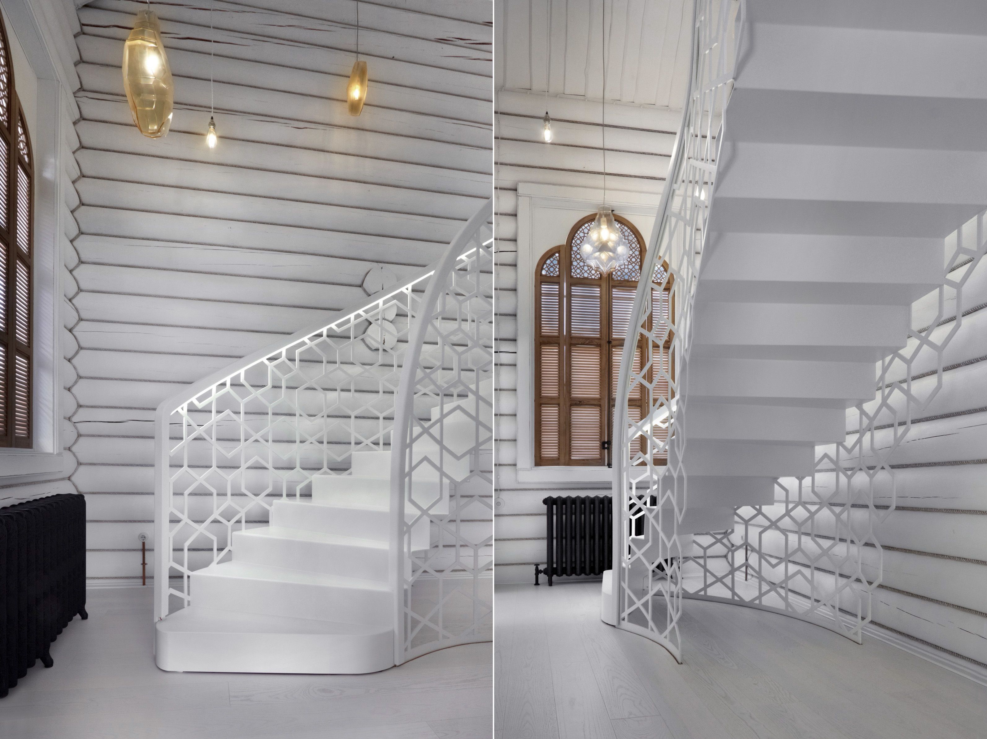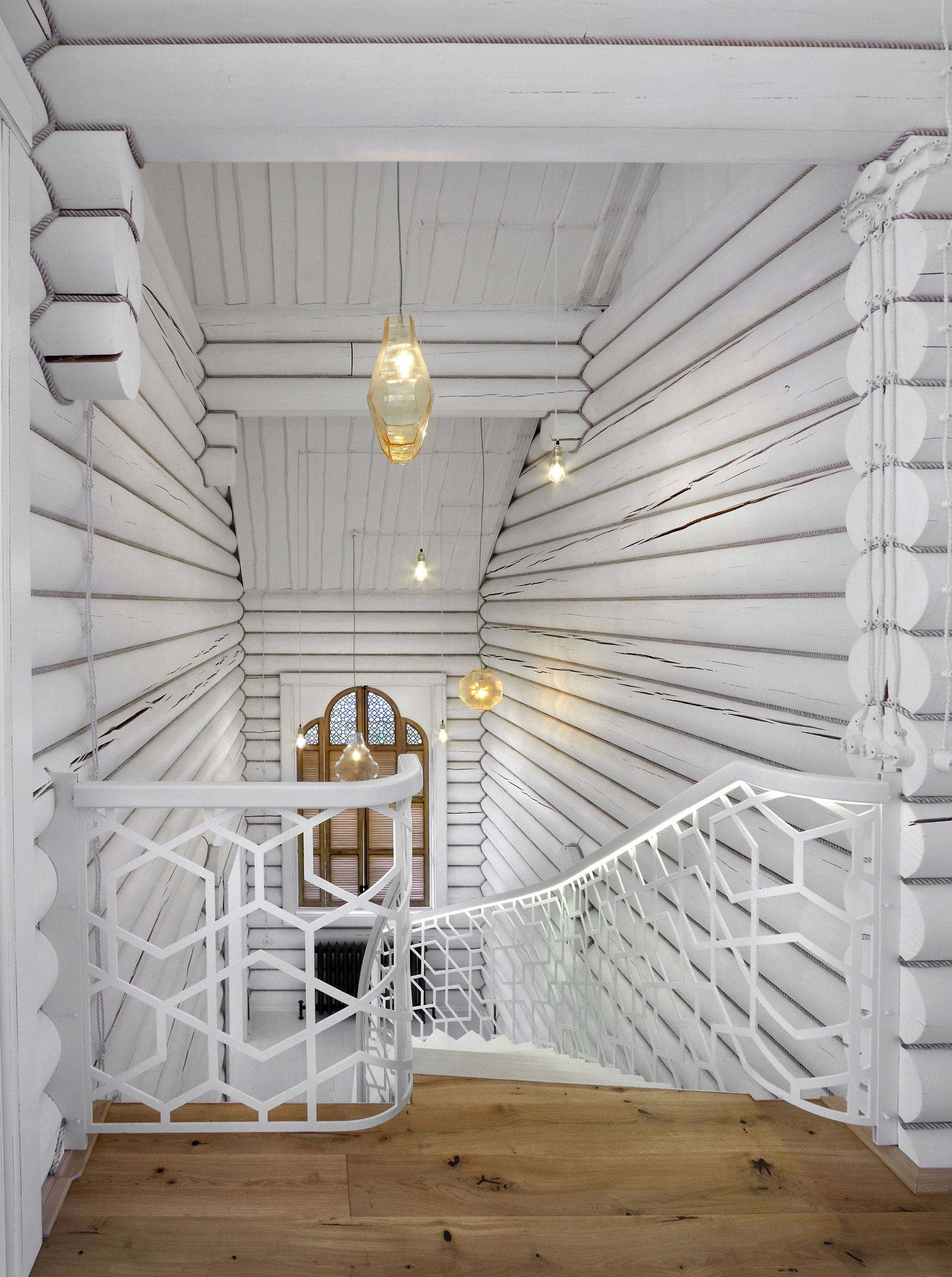 Было решено отказаться от скрипучих, массивных деревянных лестниц, ведь в доме из бревна дерева и так достаточно много, да и пространство, в которое нужно было ее вписать, оказалось узким и ограниченным. Так у Елены появилась идея легкой кружевной лестницы из металла с геометрическим орнаментом ограждения. Эскизы, эргономические расчеты и основную конструктивную схему лестницы дизайнер разработала самостоятельно. За изготовление лестницы и разработку крепежных элементов взялись конструкторы дизайн-бюро « Куб-А». Ограждение является не только украшением интерьера, но и основным несущим элементом лестничного марша. Появление геометрического узора в лестнице отразилось и на выборе орнамента для оконных ставен и подвесных светильников над лестницей, от фабрики Karmanв форме кристаллов янтарного цвета.