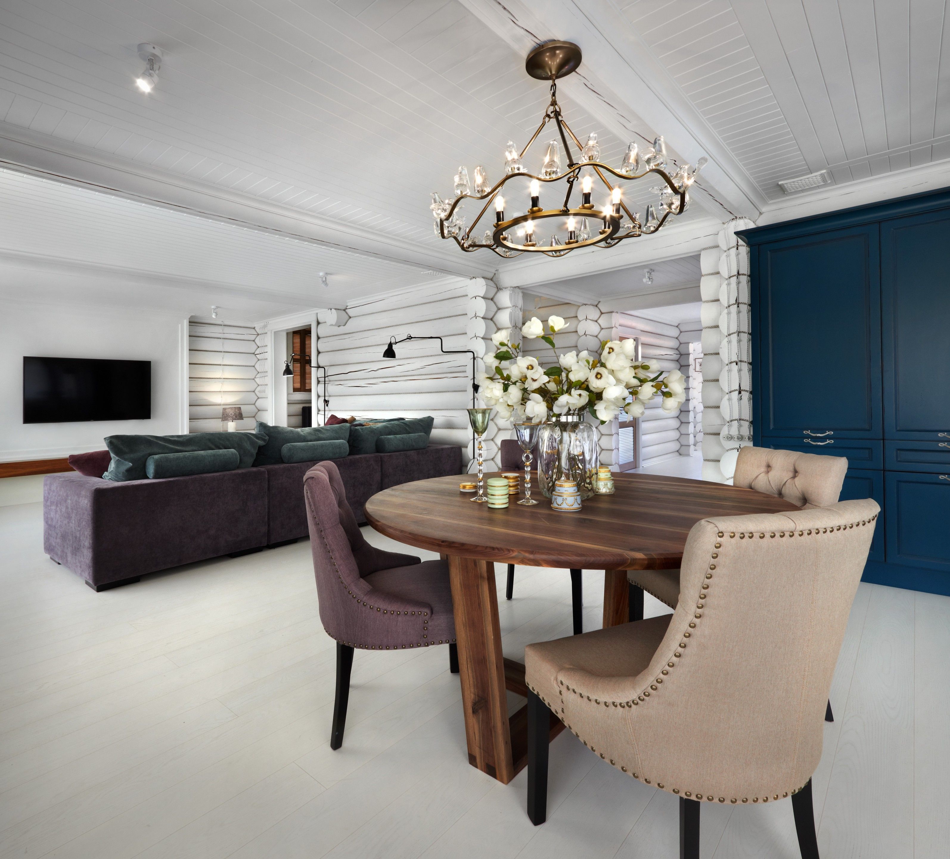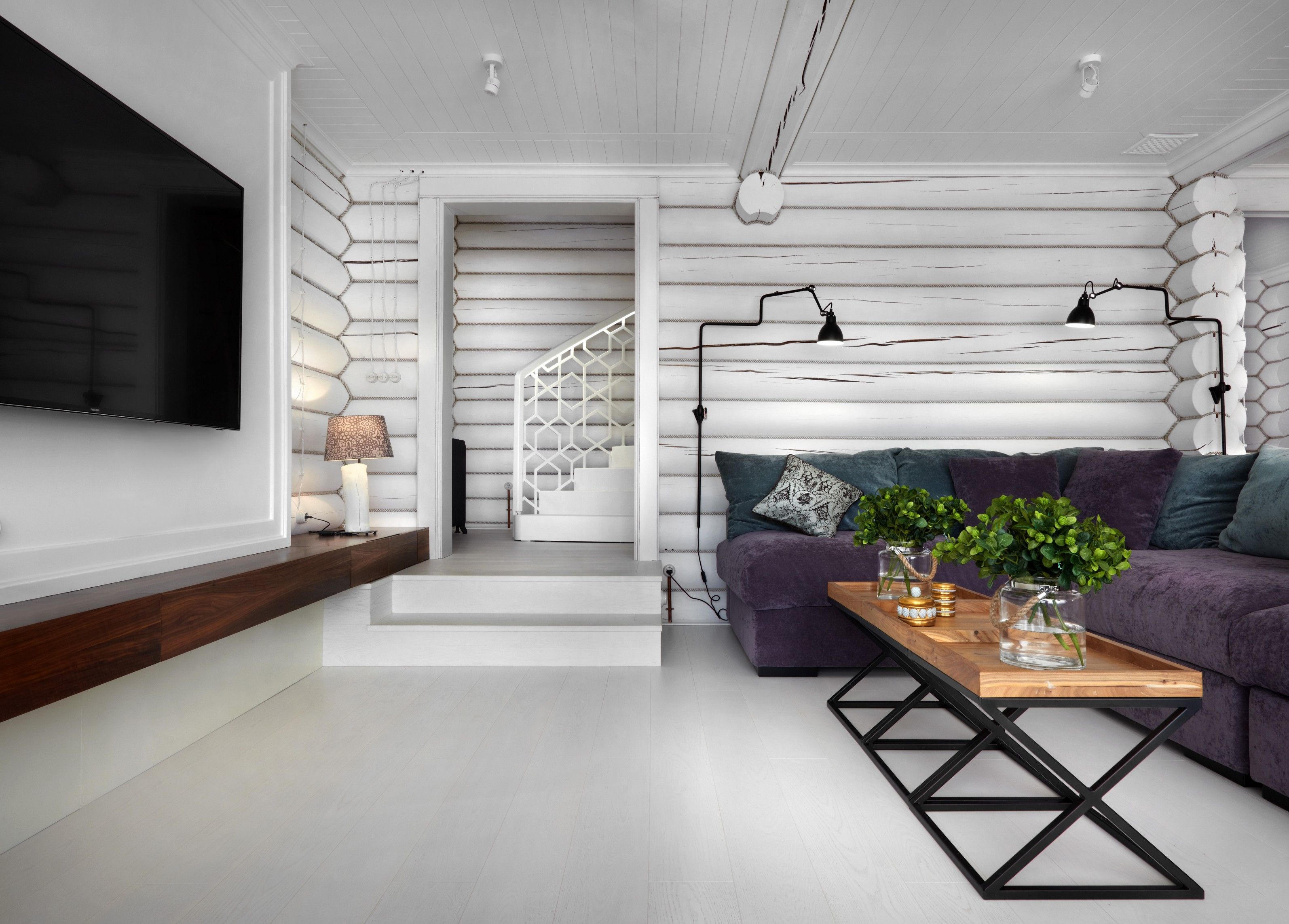 Основной задачей дизайнера было изменить традиционный взгляд к стилистике интерьера бревенчатого дома и наделить его индивидуальностью. Елена учла просьбу Заказчика о том, чтобы белый цвет стал основополагающим цветом дома. Белым стало почти все - потолки, стены, полы и, конечно же, лестница. Здесь бревно служит основой для декоративных элементов, а его новый цвет наполняет интерьер дополнительным светом и воздухом. Но, в тоже время, в интерьере присутствуют достаточно глубокие и терпкие цвета, придающие дому основательность и статус.