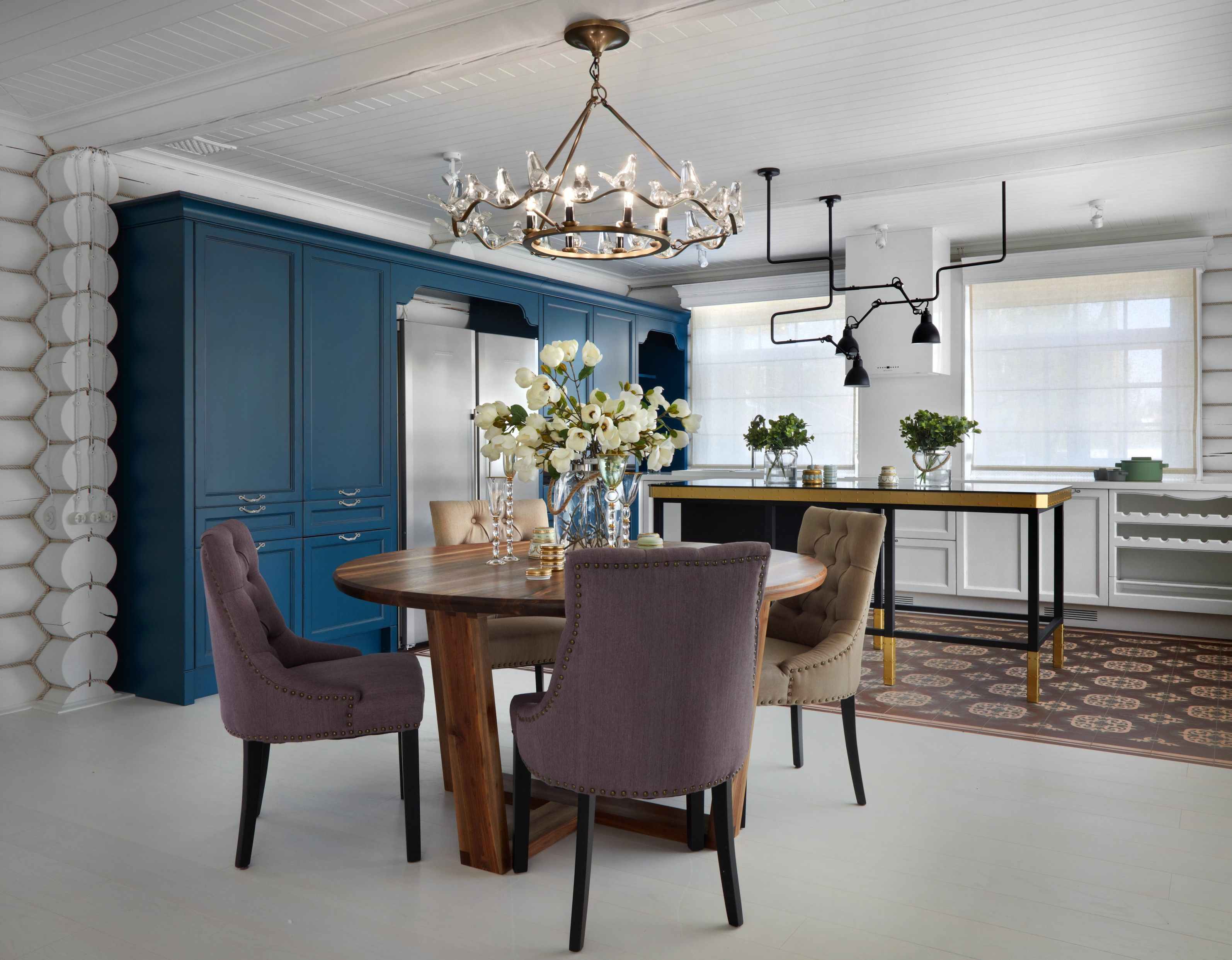 В данном проекте Елена очень тонко и гармонично переплетает элементы разных стилей. Классические фасады кухни, выкрашенные в два цвета, изготовленные салоном «Чинзатти», и индустриальный остров в центре из металла черного цвета, декорированный латунью. Остров, еще один из многих мебельных элементов интерьера, был разработан дизайнером специально для этого проекта. Графические линии светильников над островом и у дивана в гостиной фабрики LAMPE GRAS удачно сочетаются с островом, добавляя динамику в образ интерьера. А люстра в стиле арт-деко над столом из латуни с литыми стеклянными птичками от фабрики ARTERIORS придает игривое настроение и привносит дополнительный уют и близость к природе. Для полов была выбрана цементная плитка, новинка фабрики Bisazza, из коллекции DAL BIANCO для прихожей, а также BDSCLOCKWORK FARD с густым винным цветом для кухни.